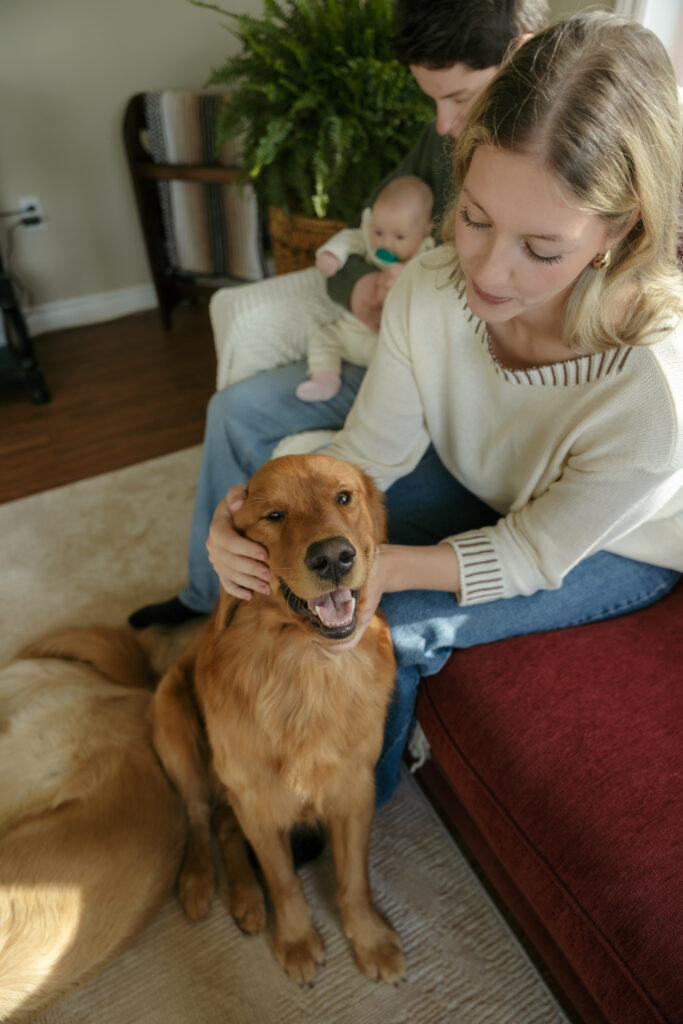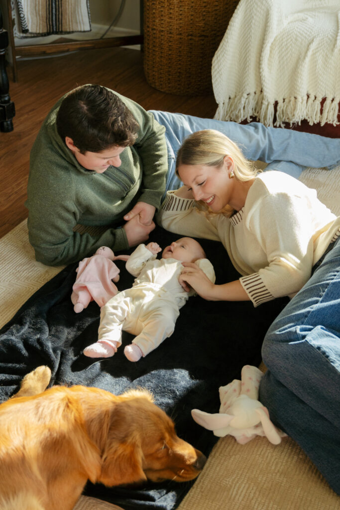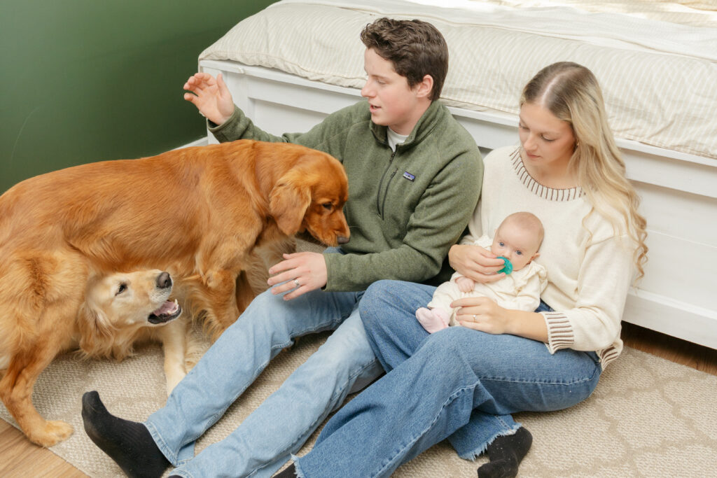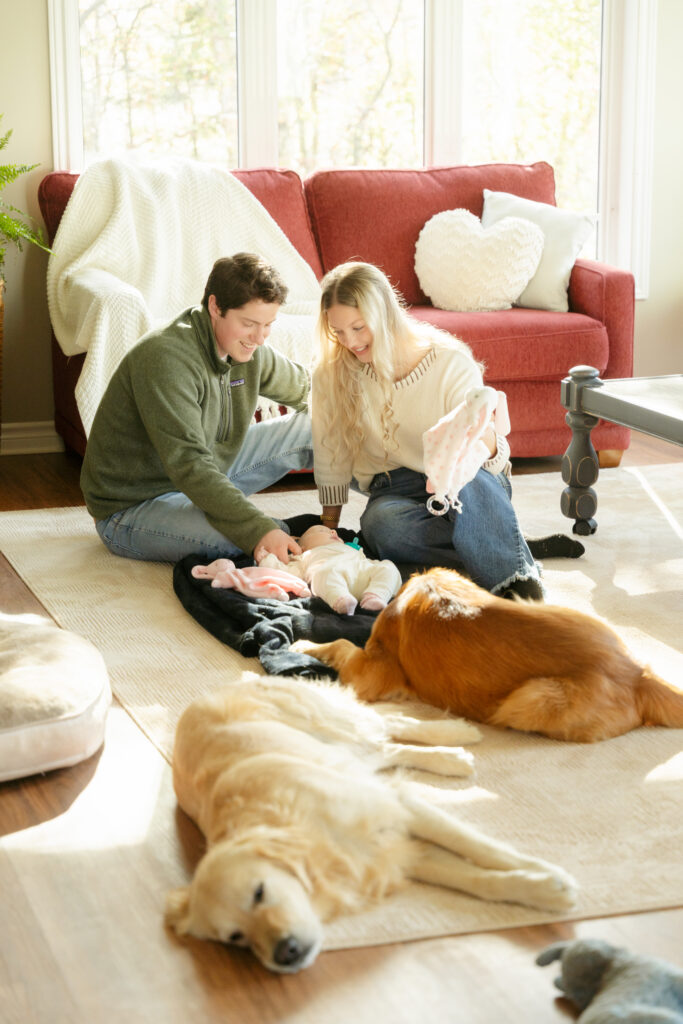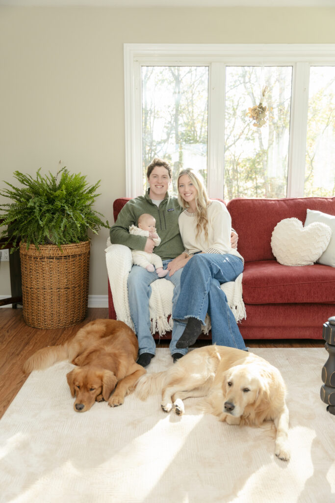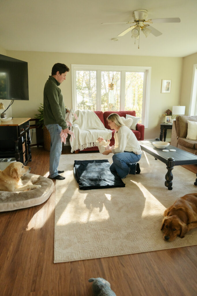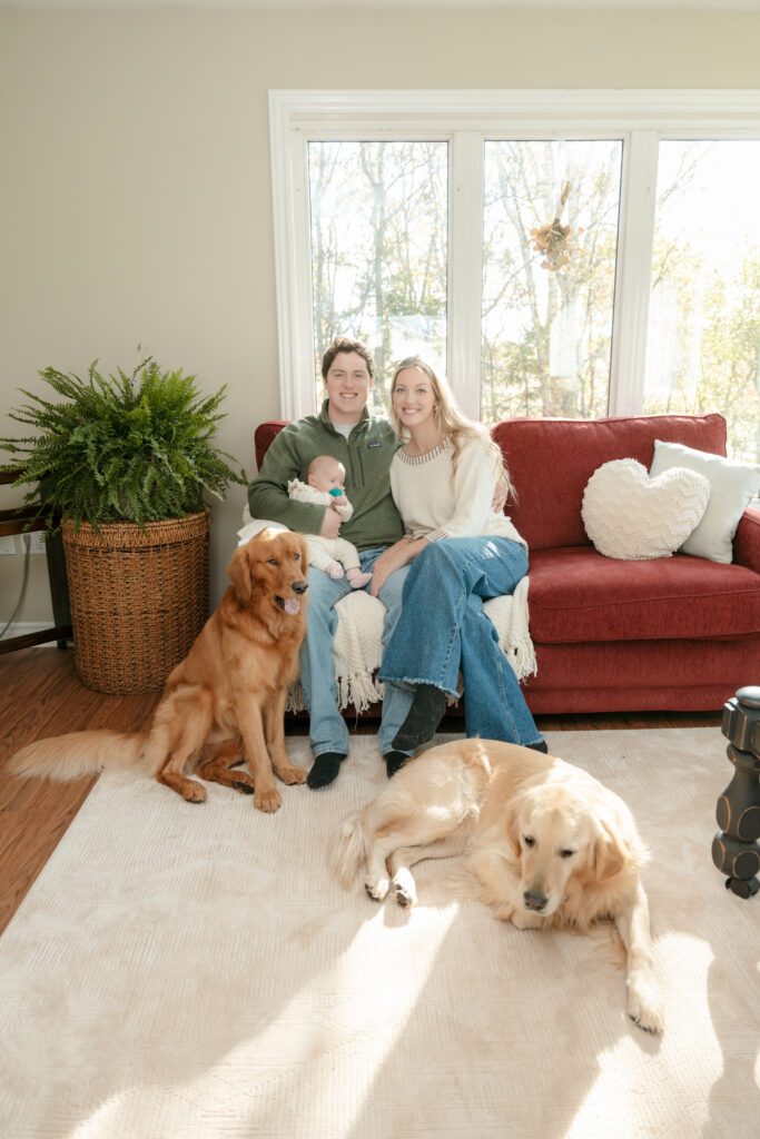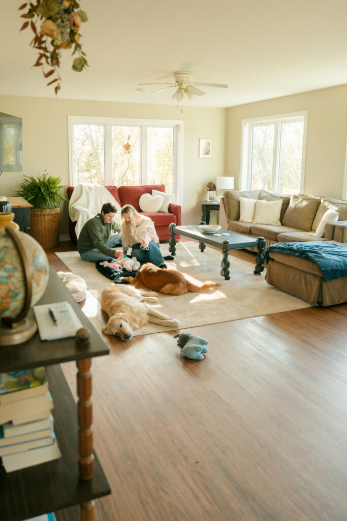 This cozy fall in home family session was everything. Soft, bright light pouring through the windows, crisp fall weather outside, tiny newborn snuggles, and pups never far from the action. Every moment felt relaxed, natural, and full of love. The kind of moments you’ll want to remember exactly as they were forever.